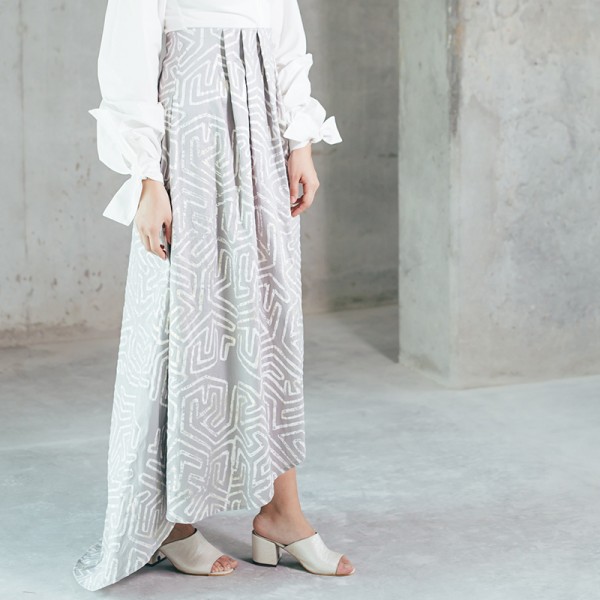 Falda Nativa maxi doble talle medio alto textura/color Natalia Londoño es una prenda especial con volumen especial, silueta asimétrica con corte que define diferentes alturas en frente y posterior. Esta falda tiene talle semi alto y pretina interna, cuenta con pliegues, capa externa texturizada sobre interna lisa y cierre invisible lateral.