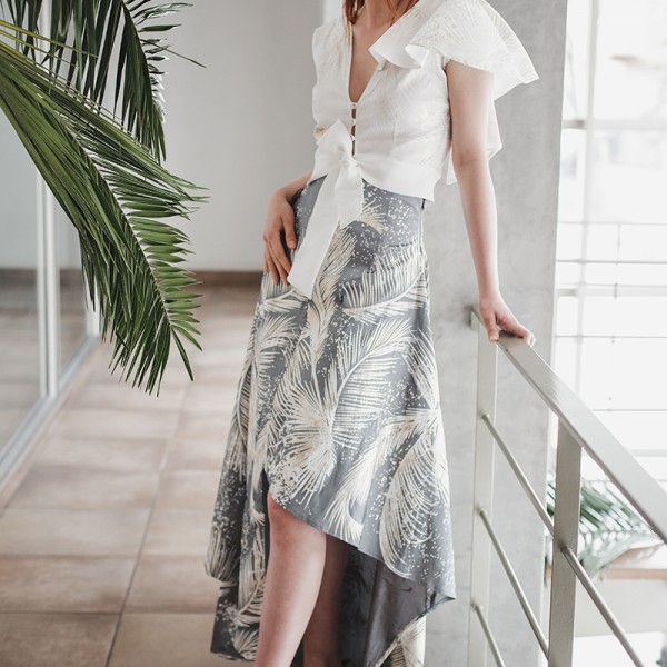 Falda Trópica maxi talle medio alto asimétrica frente textura Natalia Londoño es una pieza especial con silueta y corte orgánico, ajuste en cintura y asimetría que define diferentes largos en frente y lateral. Cuenta con talle medio alto, pretina interna y cierre lateral invisible.