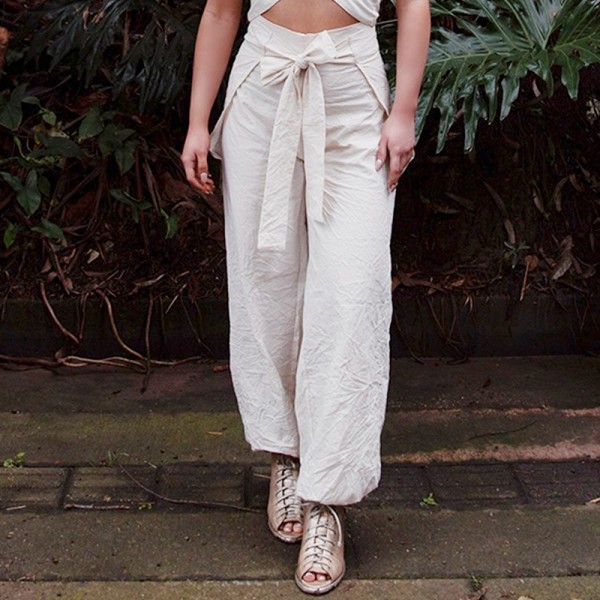Pantalón Ecológica envolvente lazos Natalia Londoño es una prenda con construcción especial, volumen único. silueta semi ajustada y envolvente. Cuenta con pinzas que definen cadera y lazos que definen tu cintura anudándolos en la parte delantera cómodamente. Cuenta con bota englobada, broches en la parte posterior ajustables a 3 medidas diferentes según el contorno de tu cintura.
