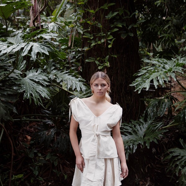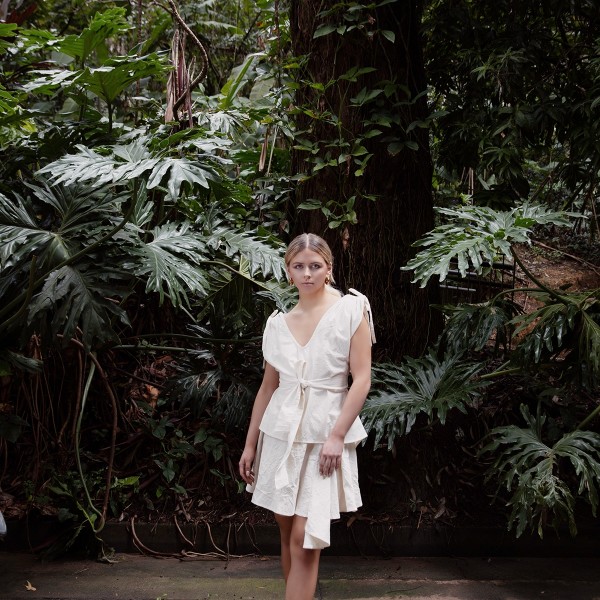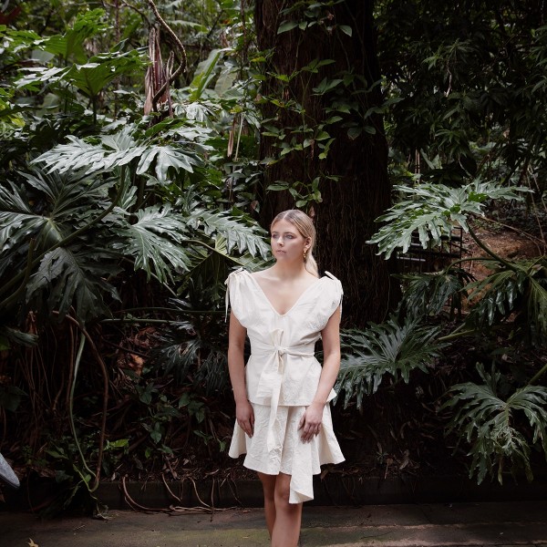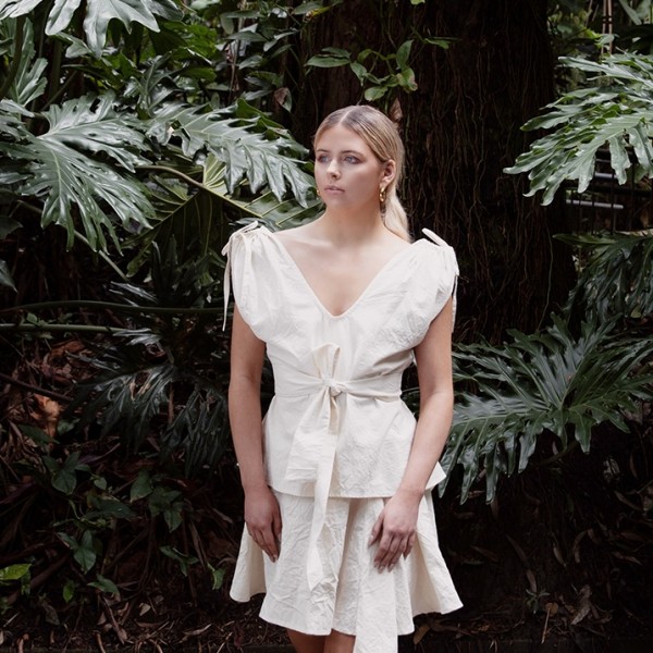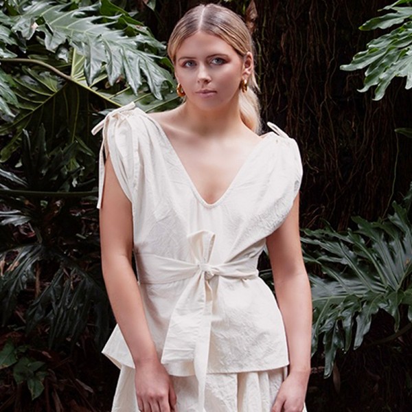 Top Ecológica recogido hombros lazo Natalia Londoño es una prenda con construcción especial, delicado escote v en frente y espalda, detalle especial de recogido y lazo en hombros, asimetría que define diferentes largos en frente y posterior y lazo que puedes ajustar a la medida de tu cintura y definir sutilmente tu silueta.