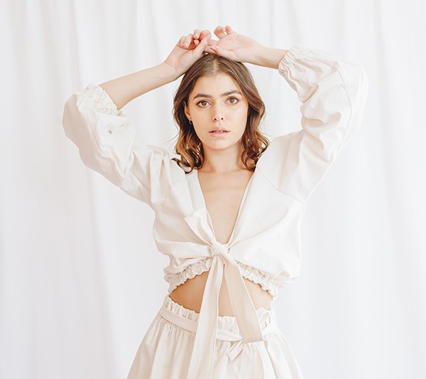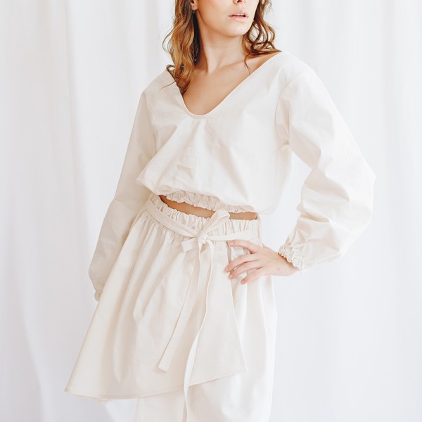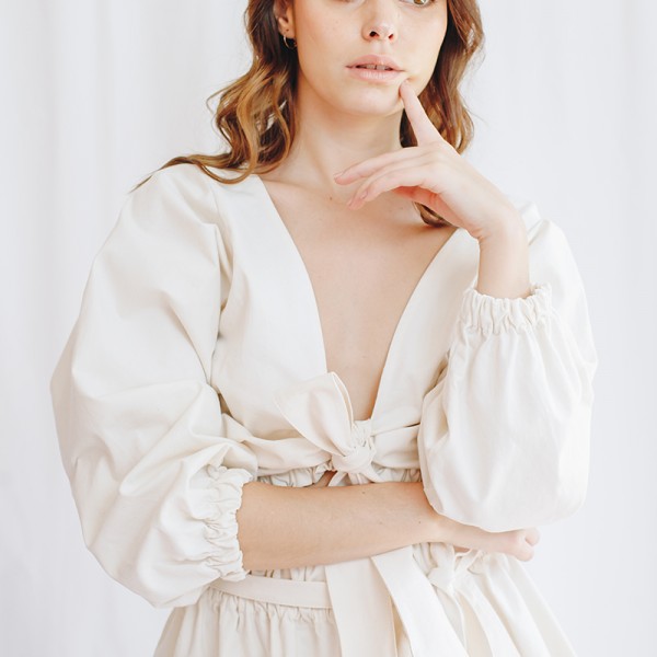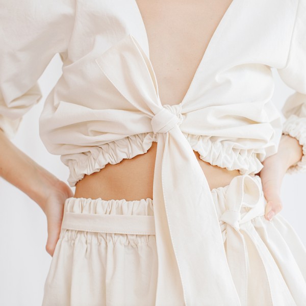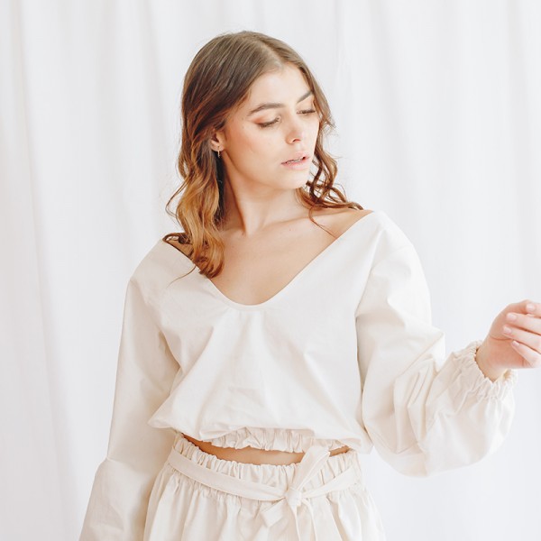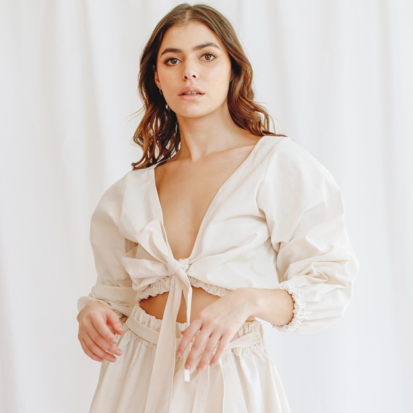 Top Orgánica escote u manga globo lazos algodón Natalia Londoño es una prenda con construcción especial, volumen orgánico, delicado escote u en frente, mangas englobadas y pretina recogida que define la silueta femenina, esta prenda puedes usarla sin lazo o anudada con lazo en centro para exponer un poco el abdomen.