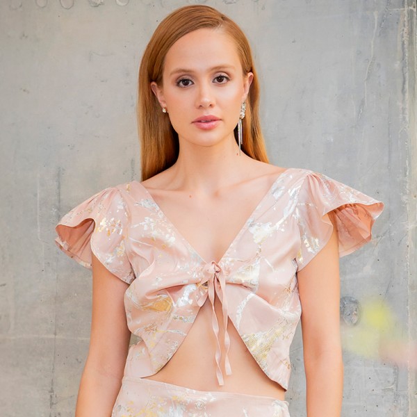 El material es tafetán con elastómero para mayor comodidad y movimiento natural. Cuenta con detalle especial de textura artesanal con pigmentos metalizados dorados y plata desarrollada por nuestra marca.