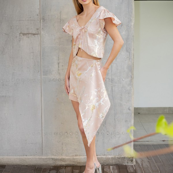 Top Renace escote u volumen mangas textura Natalia Londoño es una pieza con construcción especial,  volumen orgánico, detalle de mangas con pliegues  y silueta semi holgada. Esta prenda tiene pinzas que definen sutilmente el busto y corte asimétrico en centro abdomen.