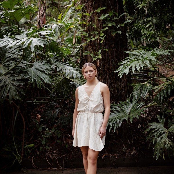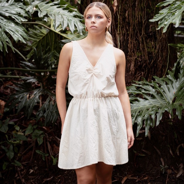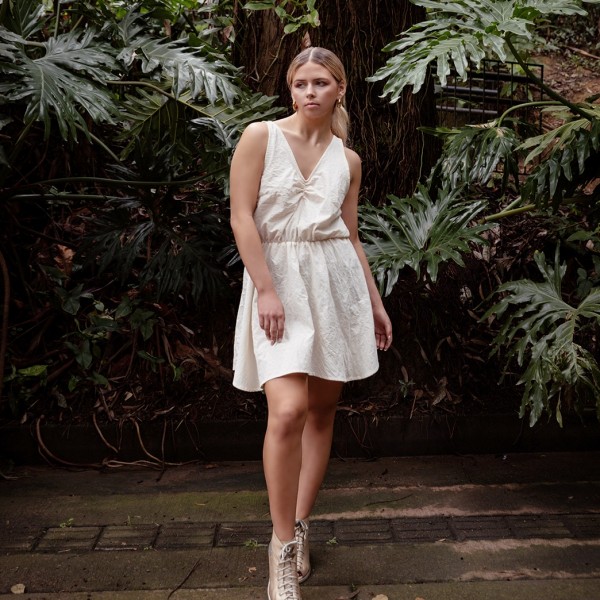 Vestido Ecológica mini escote v recogido Natalia Londoño es una prenda con construcción especial, volumen orgánico y silueta holgada que define sutilmente la cintura con recogido, delicado escote v y corte asimétrico que define diferentes alturas en frente, lateral y posterior.