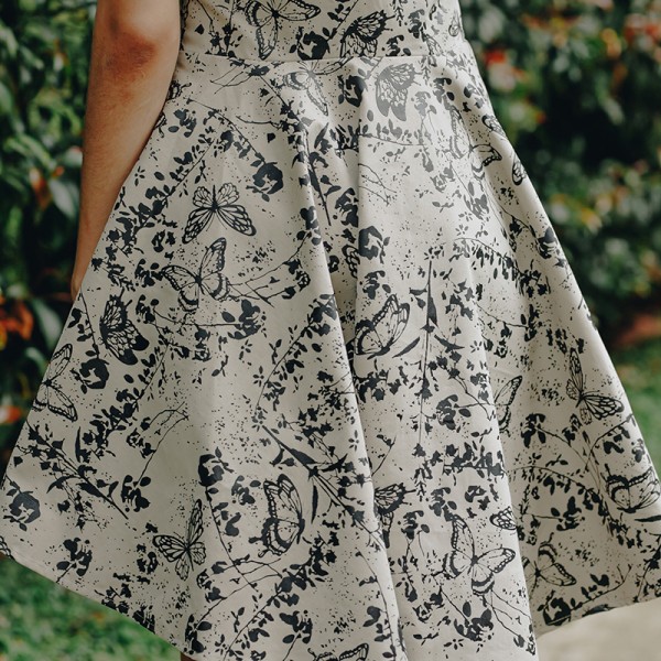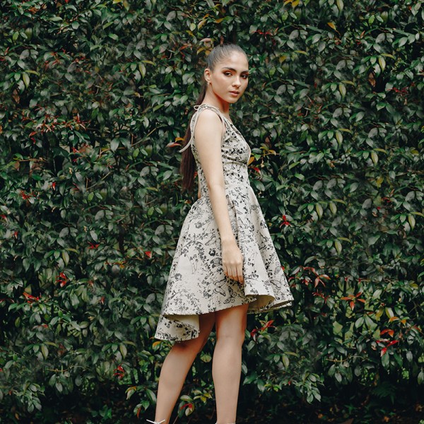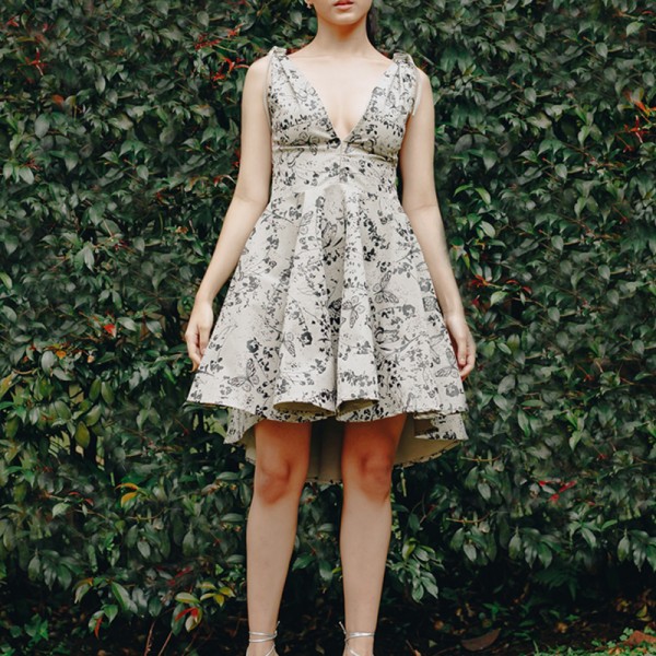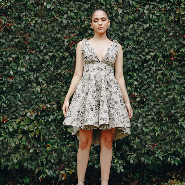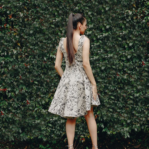 Vestido Hábitat corto escote v capa textura Natalia Londoño es una prenda con construcción especial, volumen orgánico y silueta ajustada en busto y cintura, delicado escote en v con detalle de pespuntes y falda tipo capa con corte asimétrico que define diferentes alturas en frente lateral y posterior. Esta prenda cuenta con delicados lazos en hombros para usar sueltos o recogidos y cierre invisible lateral.