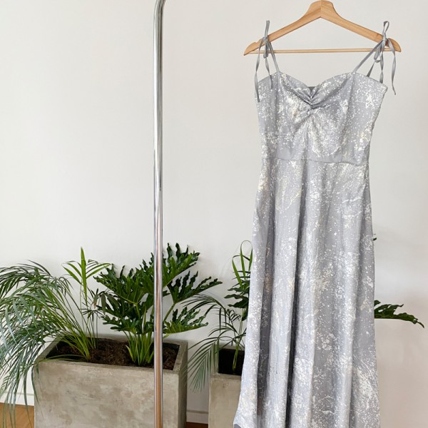 El material es tafetán con elastómero para mayor comodidad, movimiento y ajuste natural. Cuenta con detalle especial de textura artesanal con pigmentos metalizados dorados y plateados desarrollada por nuestra marca.