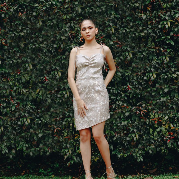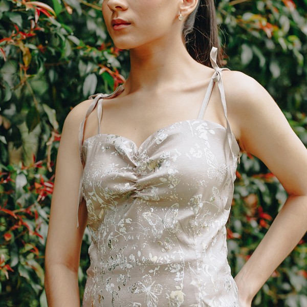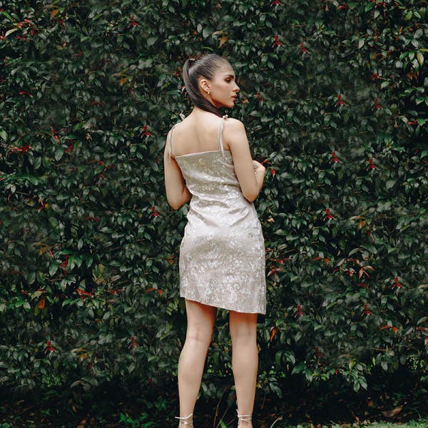El material es tafetán con elástómero para mayor comodidad y movimiento natural. Esta prenda tiene detalle especial de textura artesanal con pigmentos metalizados dorados y plateados desarrollada por nuestra marca.