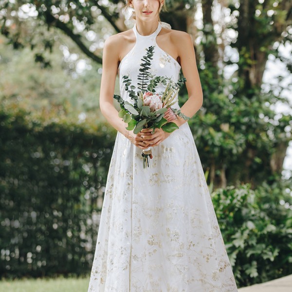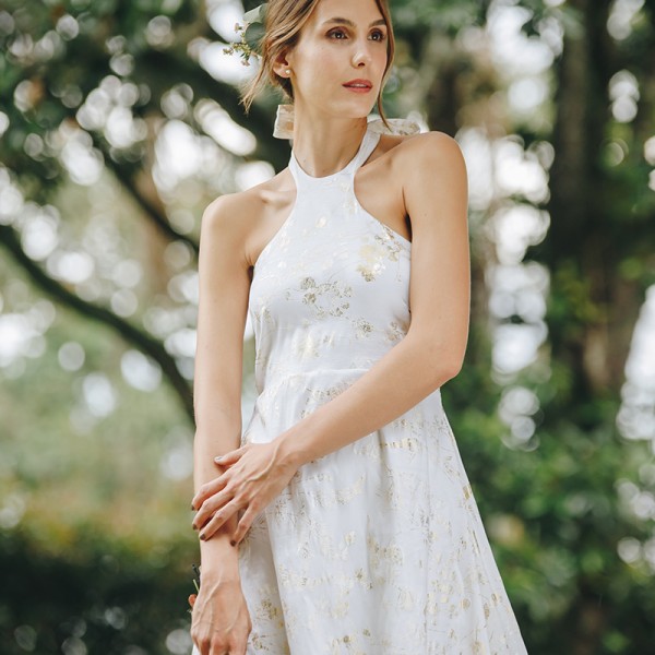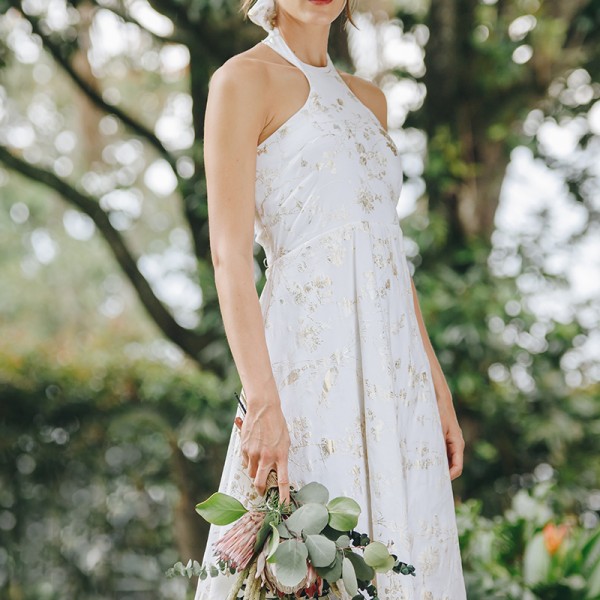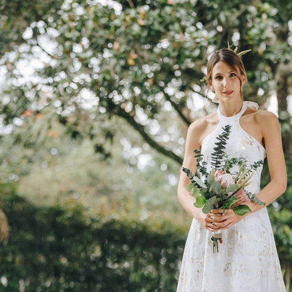 Vestido Novias esqueleto maxi asimétrico textura Natalia Londoño es una prenda con construcción especial, detalle esqueleto en frente con lazos al cuello.